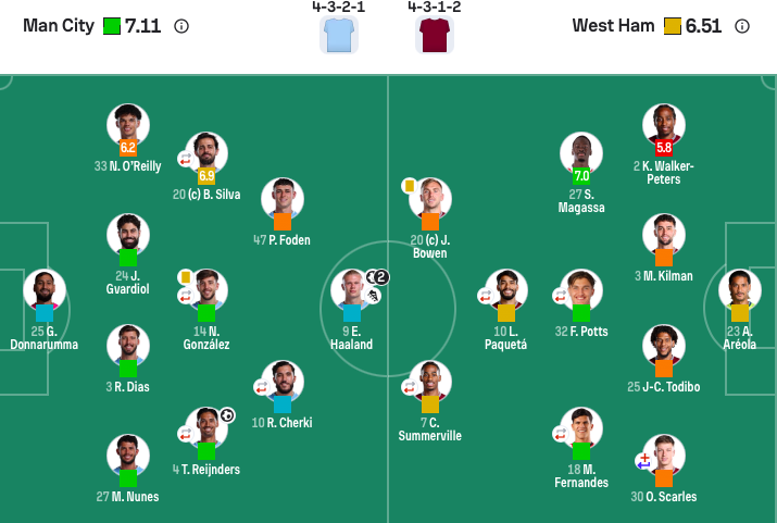 曼城首發(fā):25-多納魯馬、3-魯本-迪亞斯、24-格瓦迪奧爾、27-努內(nèi)斯、33-奧賴利、14-尼科·岡薩雷斯(67’82-劉易斯)、20-B席(75’63-穆卡薩)、4-賴因德斯(67’26-薩維尼奧)、47-福登、10-謝爾基(67’45-胡桑諾夫)、9-哈蘭德。