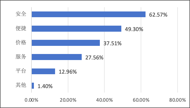 調查結果顯示,超六成(62.57%)受訪者將安全作為選擇網約車的首要關注因素,占比明顯高于便捷性(49.30%)和價格(37.51%)。說明安全已成為超越便捷與價格的需求,是平臺建立信任的核心基礎。