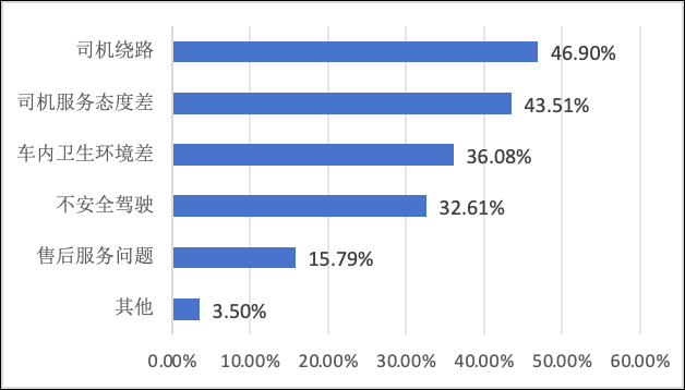 在選擇網約車時,消費者對服務風險高度敏感。受訪者最擔心遇到的問題包括“司機繞路”(46.90%)和“司機服務態度差”(43.51%)。而在實際消費過程中,消費者最常遇到的則是“不合理收費”(38.35%)和“系統定位不準”(33.25%)等運營層面問題。