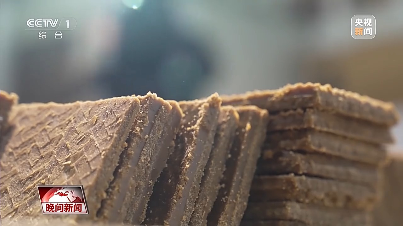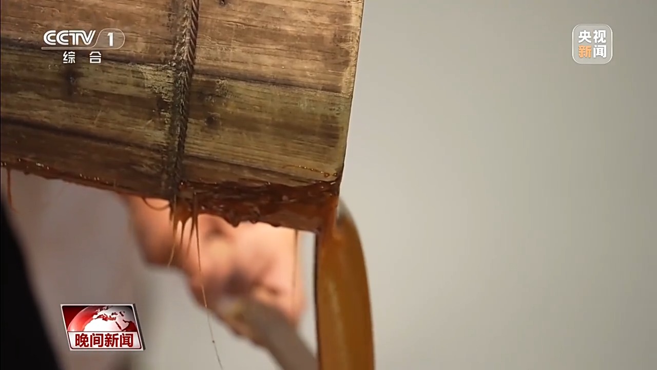 經過近3小時的高溫熬煮后,師傅們會將糖漿倒入特制的竹簟上,隨后用木質糖刀反復攪打,等到糖漿冷卻成固體,表面出現像“蝴蝶花”一樣的白色結晶后,就算制作完成了。這種方法做出來的紅板糖爽口松脆、清香甘甜、入口即化。