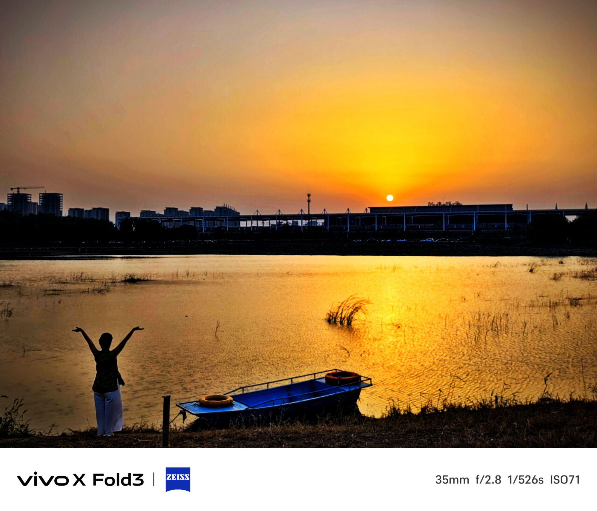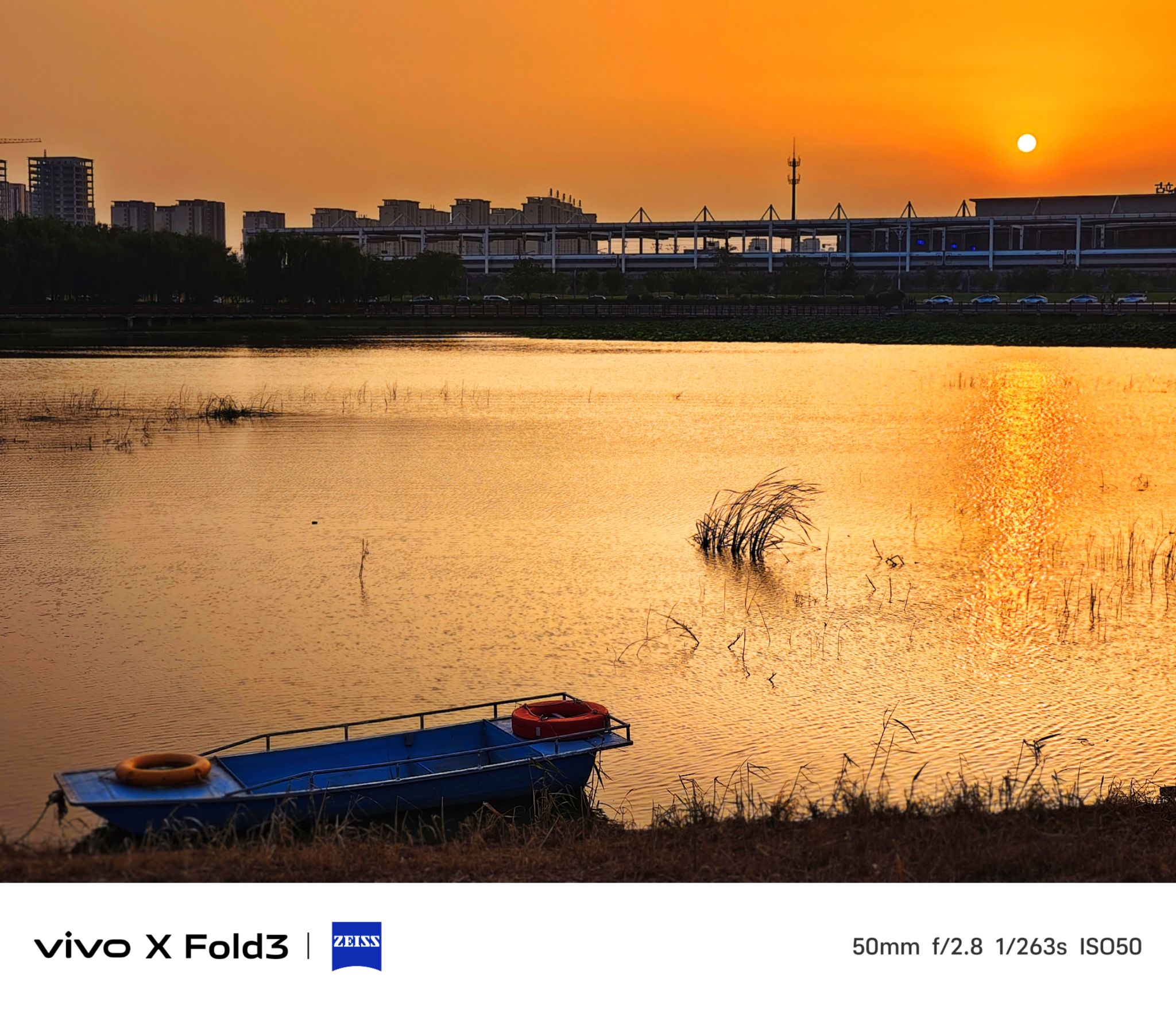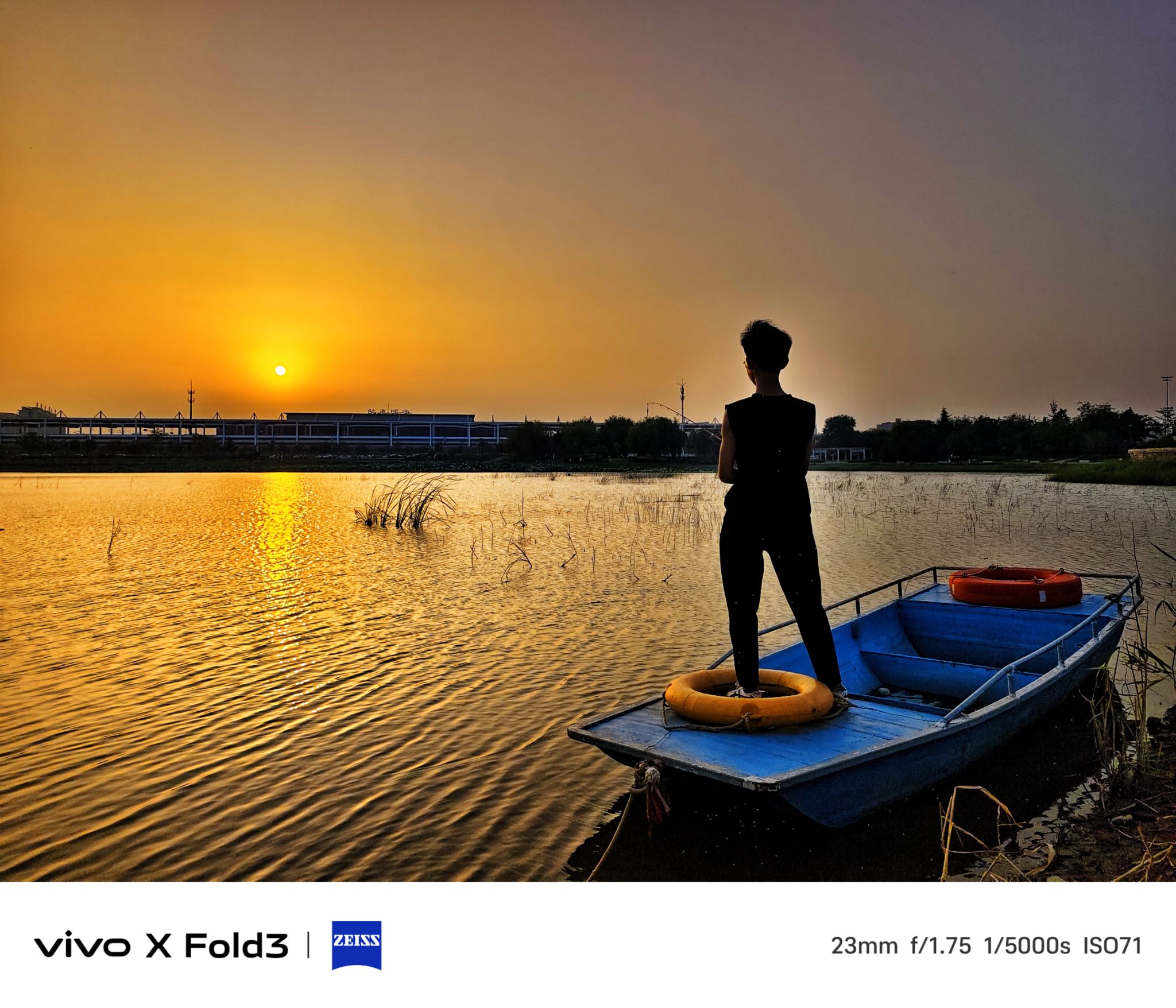 岸邊的蘆葦在晚風里輕輕搖曳,一艘藍色的小船靜靜泊在水邊,橙紅的救生圈成了畫面里俏皮的點綴。我站在湖畔,看著落日一點點貼近地平線,余暉把身影拉得很長,抬手張開雙臂的瞬間,仿佛擁住了整個秋日的溫柔。有人踏上小船,立于船頭望向落日,剪影在金輝里成了一幅流動的畫,這一刻,時間好像都慢了下來。