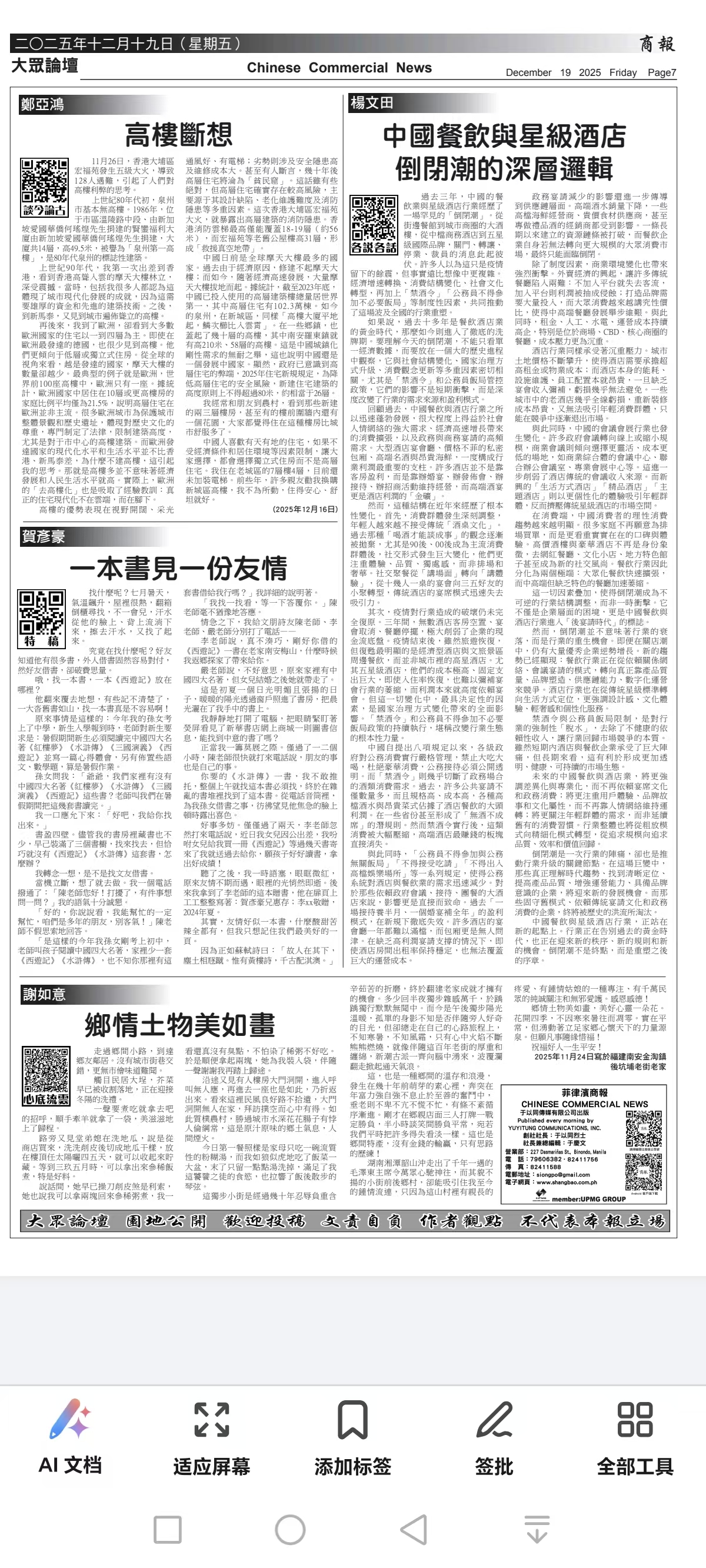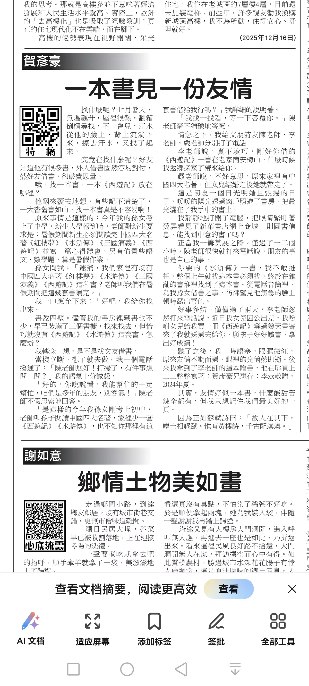 中國作家協(xié)會會員賀彥豪的作品《一本書見一份友情》刊登在《菲律賓商報》大眾論壇版2025年12月19日,感謝編輯的厚愛,感謝你的關注點贊[抱拳][玫瑰][握手