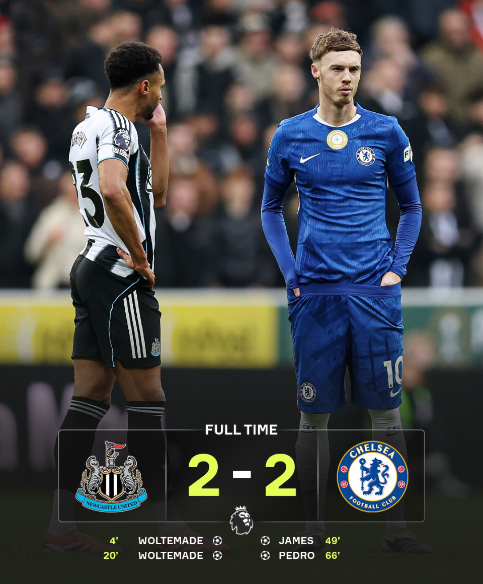 坐鎮圣詹姆斯公園的紐卡斯爾一上來就打出了夢幻開局:第4分鐘,切爾西門將桑切斯雖完成撲救,但沃爾特馬德補射破門,喜鵲閃擊得手,紐卡1-0領先;第20分鐘,戈登傳中再度找到沃爾特馬德,后者梅開二度,紐卡2-0領先,短短20分鐘,切爾西完全被打蒙圈了。