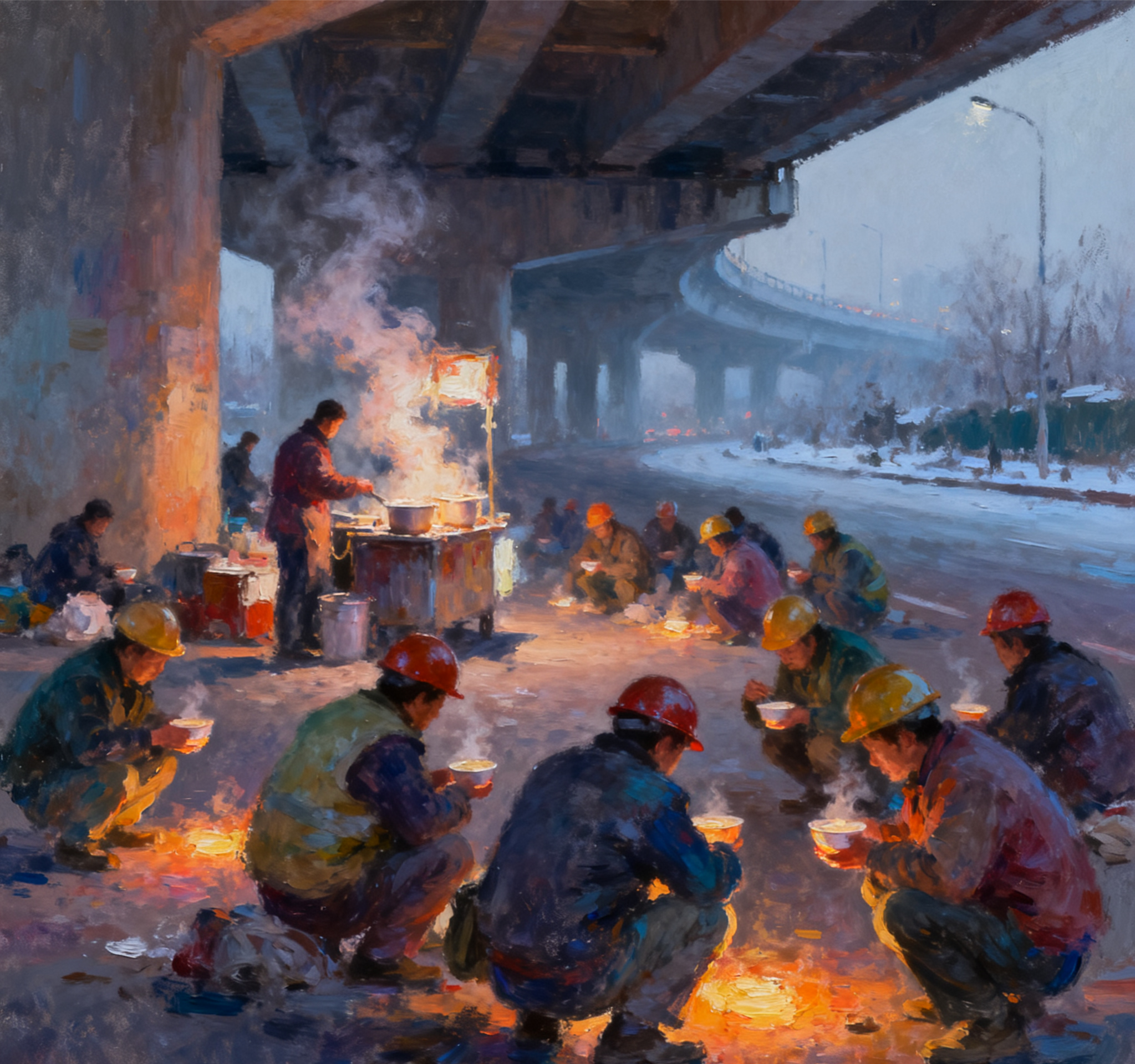 詩歌的情感表達克制而深沉,沒有激烈的控訴,也沒有刻意的煽情,卻在平淡敘述中積蓄著震撼人心的力量。“兩塊錢就可以續的大米粥”“工錢被壓得很薄”“卻慶幸比在老家強得多”,這些直白的表述真實呈現了勞動者的生存境遇,他們的無奈與堅韌、辛酸與樂觀,都在樸素的語言中自然流露。“城市的燈火亮得晃眼 / 他們只取一小片 / 只要能夠照亮 / 往家寄錢的匯款單”,寥寥數語,將勞動者的卑微訴求與偉大奉獻形成強烈對比,字里行間滿含對底層群體的悲憫與敬意。結尾 “我不敢再來,怕撞見 / 他們眼里的光 ——/ 那光,比任何無奈的嘆息 / 都讓人落淚”,以 “我” 的視角收束,將情感推向高潮,那束 “眼里的光” 是困境中的堅守、對生活的希望,既讓人心生敬佩,又讓人倍感心酸,情感張力十足。