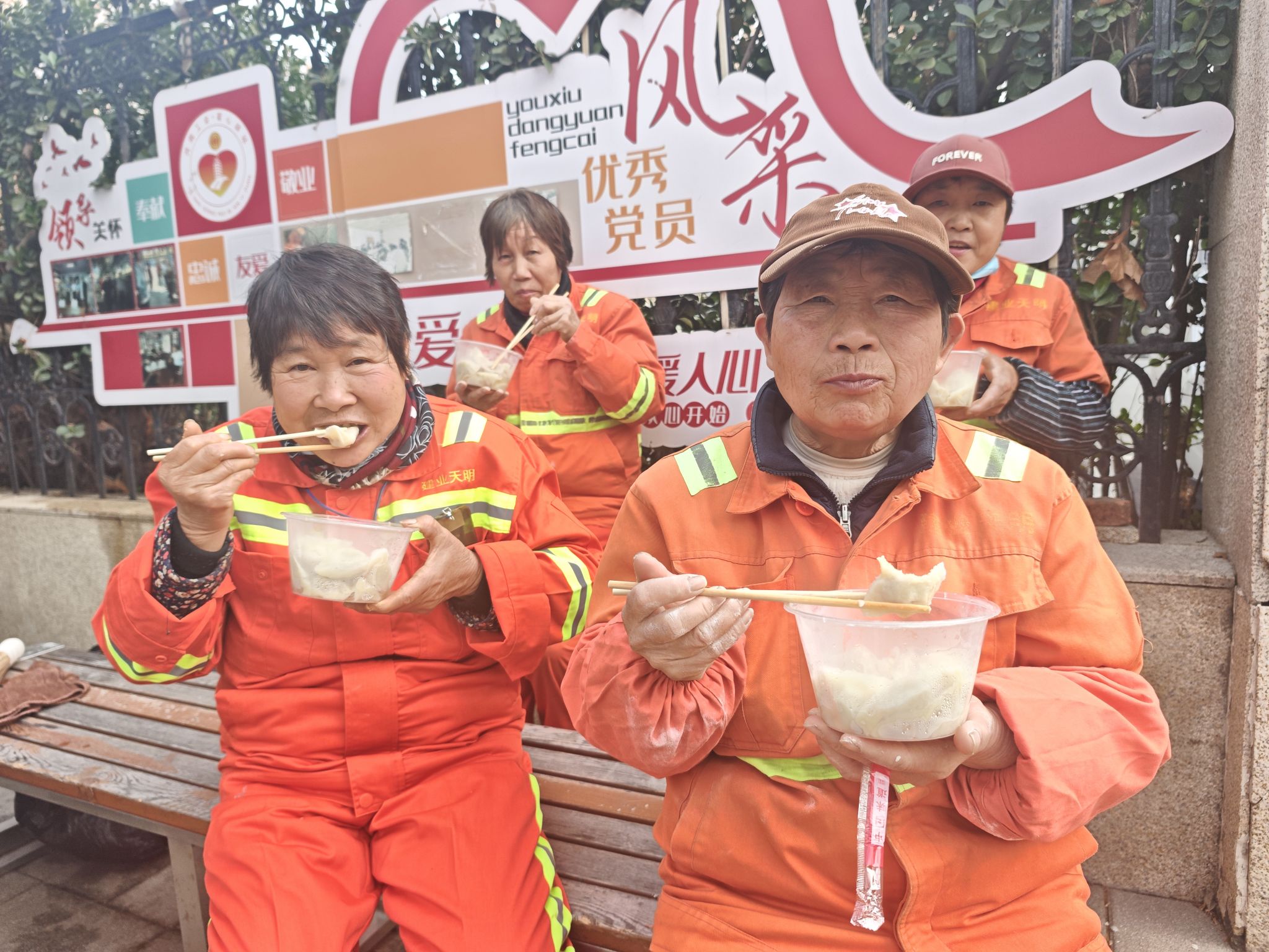 ? ? ? 為表達對這些城市堅守者的敬意與關愛,一場“愛心餃子暖寒冬”特別活動拉開序幕,為早起的環衛工人送上熱騰騰的餃子。