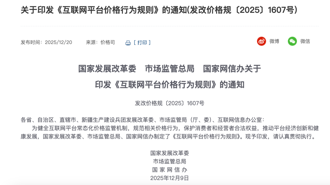 此前,國家發展改革委、市場監管總局、國家網信辦于2025年8月23日至9月22日就《行為規則》公開征求社會意見。根據各方意見,進一步修改完善《行為規則》,著力規范價格行為、推動公開透明、增強各方協同,構建良好平臺生態。