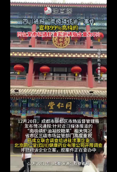 成都通報“南極磷蝦油”事件:已成立聯合調查組進駐北京同仁堂(四川)健康藥業有限公司開展調查