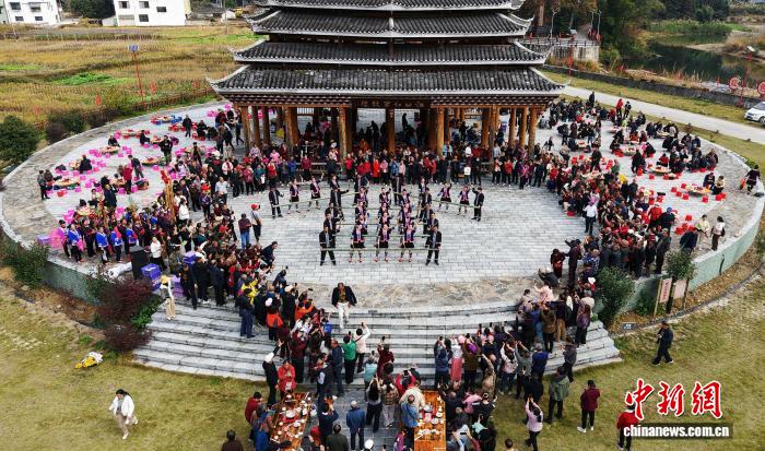 圖為當地侗族同胞在表演節目。(無人機照片)韋吉陽 攝