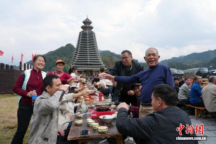 圖為眾多游客在體驗侗族百家宴。于琳鈺 攝