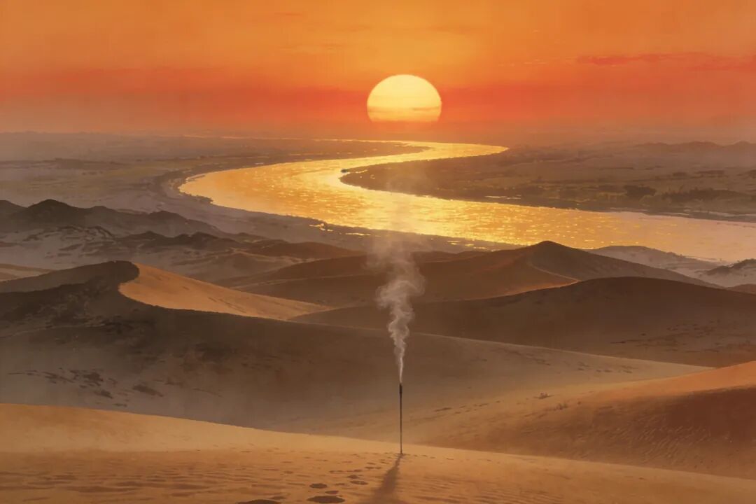 這首詩以奉使邊塞的旅程為經緯,在蒼茫的天地圖景中勾勒出大唐王朝的恢弘氣象。開篇“單車欲問邊,屬國過居延”以簡凈筆觸點明使者輕車簡從穿越遼闊屬國的身份與路線;“征蓬出漢塞,歸雁入胡天”則巧用隨風遠飄的蓬草與北歸鴻雁的意象,在暗示個人漂泊感的同時,也暗合了季節流轉與疆域無界的自然韻律。頸聯“大漠孤煙直,長河落日圓”如巨幅畫卷陡然展開——大漠孤煙的垂直升騰與長河落日的渾圓沉墜,以極致簡練的幾何線條與冷暖色塊,構筑出塞外天地間撼人心魄的崇高美感,這十個字遂成為鐫刻在民族審美記憶中的不朽印章。尾聯“蕭關逢候騎,都護在燕然”從自然奇觀轉回人事,在邊關偵察騎兵的指引下,將詩意的終點落于前線統帥所在的燕然山,既暗含對將士功業的稱頌,更以漢將竇憲燕然勒石的典故,昭示著大唐國威遠播的歷史延續性。全詩通過“單車—蓬雁—孤煙落日—候騎”的視覺推移,在虛實相生的空間轉換中,讓一次普通的公務出行升華為對帝國邊疆的詩意巡禮,最終在長河落日的永恒光輝里,完成了盛唐精神與壯美自然的雙重禮贊。