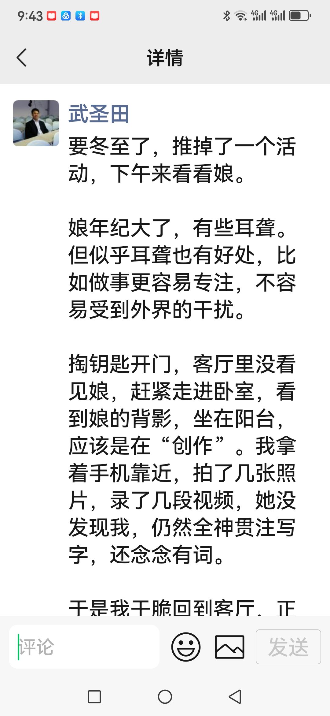 點開那條朋友圈時,我的眼眶倏然就濕了。武圣田推掉了推杯換盞的應酬,踏著冬日的清寒,去老屋看娘。那個耳朵有些聾的老人,正坐在陽臺的暖陽里,專注地寫寫畫畫。筆尖劃過紙張的沙沙聲里,她念念叨叨,把對兒女的牽掛、對過往親人的惦念,都揉進了一筆一劃的溫柔里。武圣田就那樣在娘的身后靜靜站了二十多分鐘,生怕驚擾了這份安然的專注。他輕手輕腳地往復于客廳與臥室之間,悄悄錄下一段段細碎的日常。臨走時,他的衣兜里揣著娘親手炸的麻葉,金黃酥脆,裹著滿當當的煙火氣。