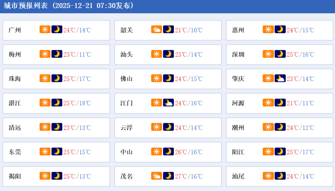 21日起,受北方弱冷空氣南下影響,廣東氣溫小幅下降,全省大部多云間晴,局部有零星小雨。