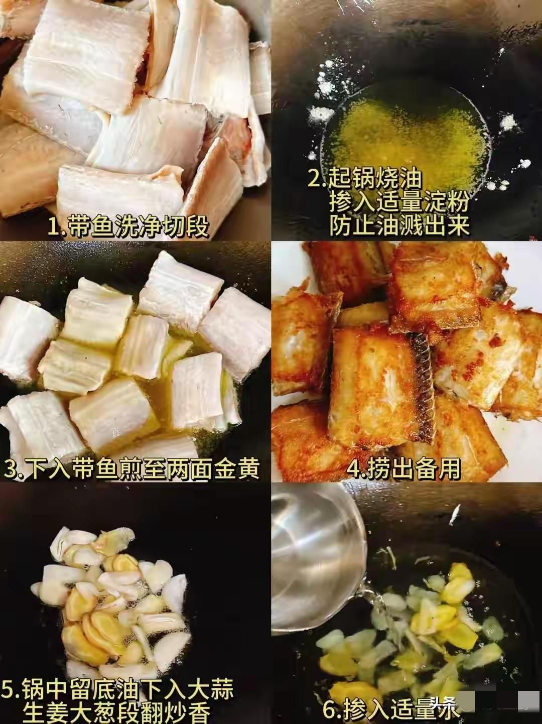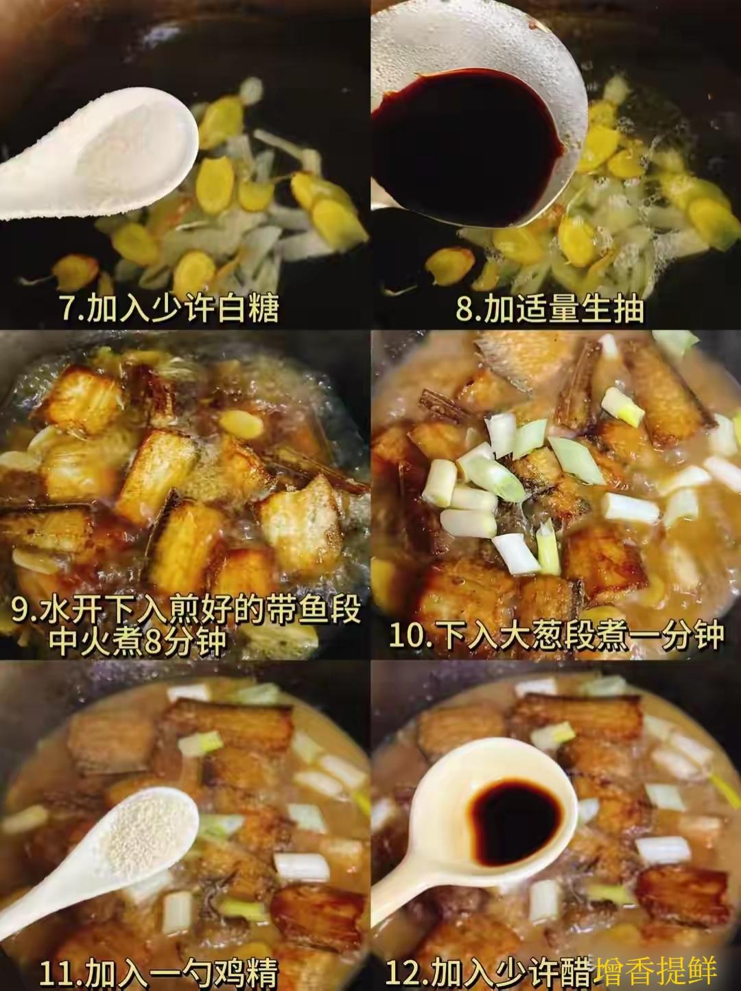鍋里留底油,下姜片、蒜瓣、干辣椒熗鍋,香味出來了加兩勺生抽、一勺老抽、一勺料酒、少許糖,加水燒開。把煎好的帶魚放回去,湯汁剛沒過魚身就行。大火燒開轉中小火,蓋上蓋子燜十分鐘。