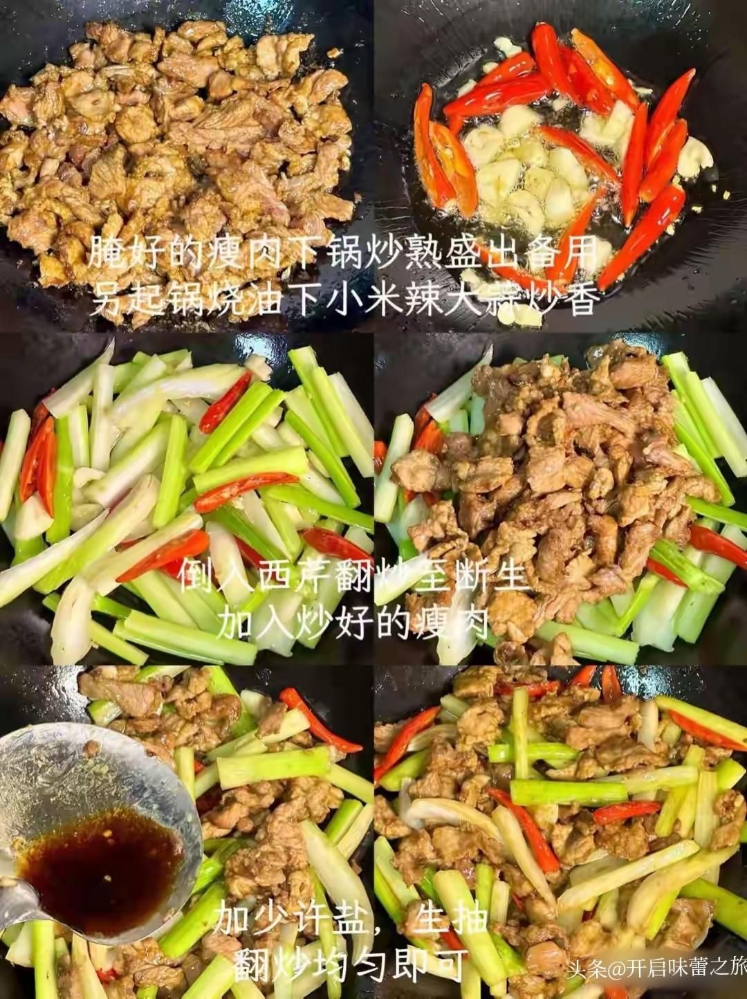 重新起鍋燒油,下蒜片爆香,西芹和紅椒倒進去大火翻炒一分鐘。肉片回鍋,沿鍋邊淋少許生抽,加鹽調味,快速翻炒均勻就出鍋。