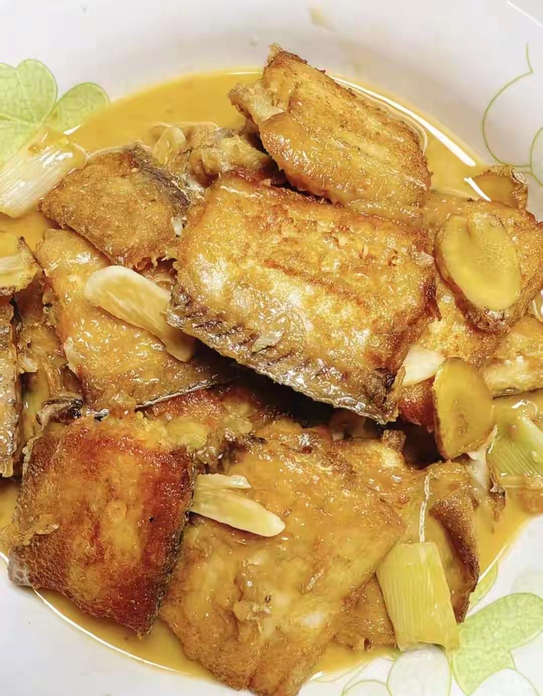 鍋里放油,燒熱后下帶魚段,中小火煎到兩面金黃。帶魚皮薄,別急著翻動,等定型了再翻面。煎好后盛出備用。
