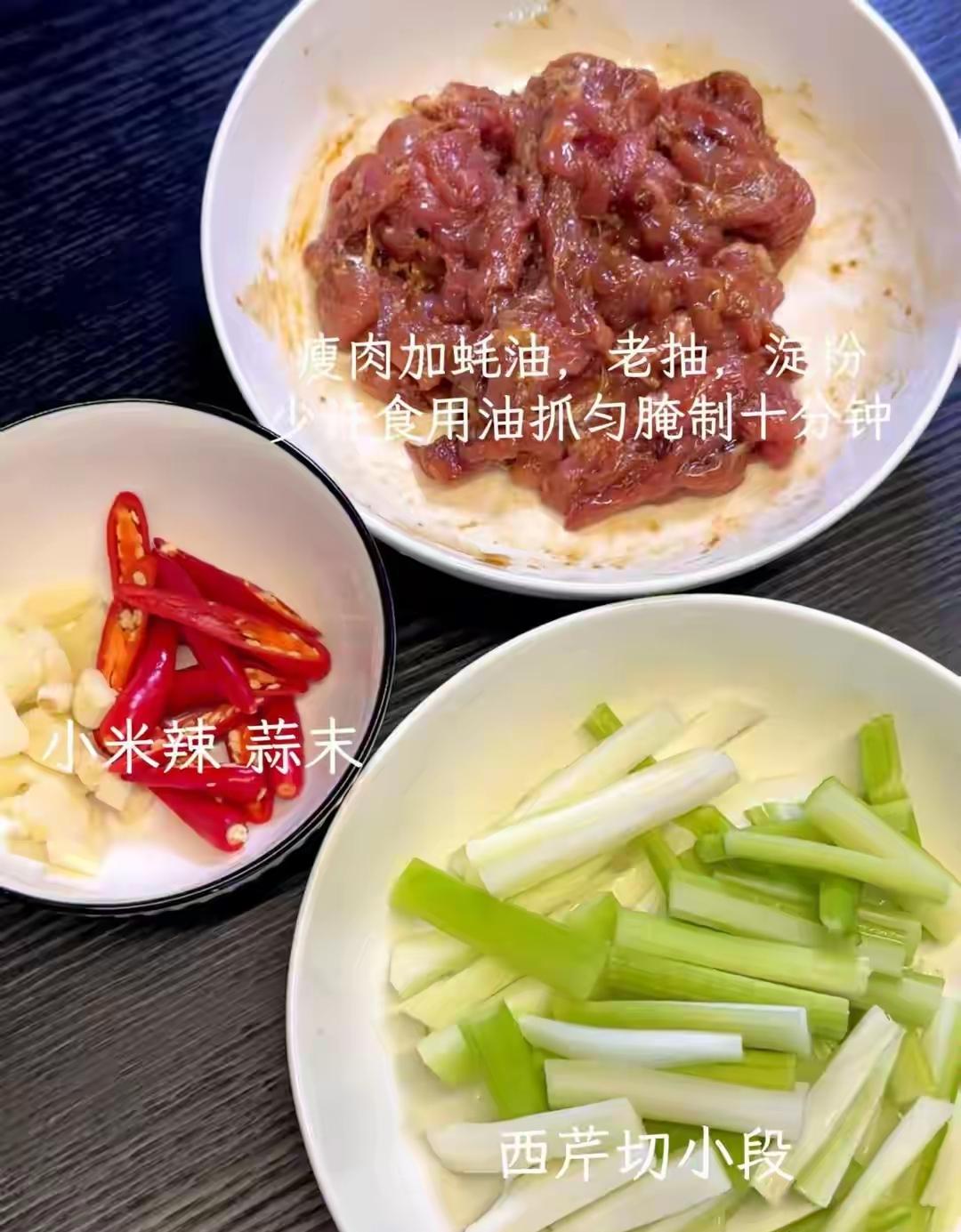 西芹撕去老筋,斜切成片。紅椒少許切菱形塊配個色。鍋里水燒開,下肉片快速劃散,一變色就撈出來,這樣最嫩。
