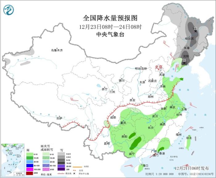 12月23日08時至24日08時,內(nèi)蒙古東北部、東北地區(qū)等地部分地區(qū)有小到中雪或雨夾雪,其中,黑龍江中部、吉林東部、遼寧中東部等地部分地區(qū)有大雪,局地暴雪(10~13毫米)。黃淮東部、江淮大部、江漢東部、江南北部和西部、西南地區(qū)東部、華南大部、臺灣島大部等地部分地區(qū)有小雨,其中,山東半島、貴州東南部、廣西西南部和東北部、廣東東南部等地部分地區(qū)有中雨。內(nèi)蒙古東南部、青海南部等地部分地區(qū)有4~6級風(fēng)。