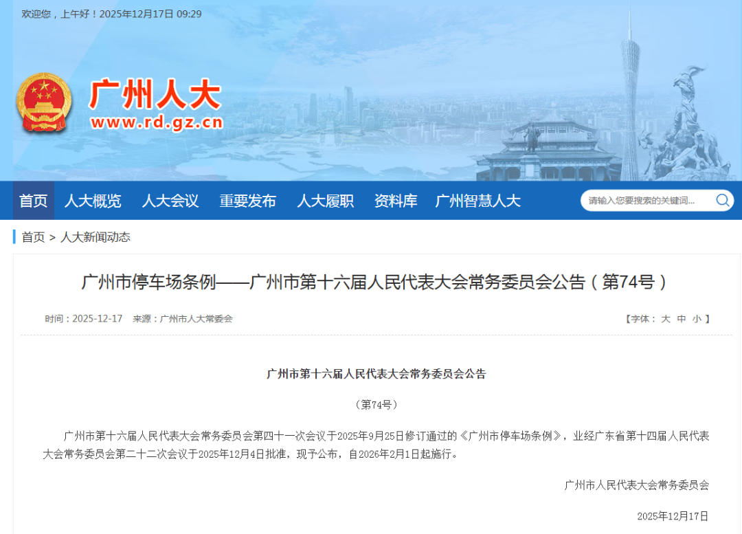 廣州市十六屆人大常委會第四十一次會議修訂通過的《廣州市停車場條例》(下稱《條例》),經省十四屆人大常委會第二十二次會議批準,將于2026年2月1日起施行。