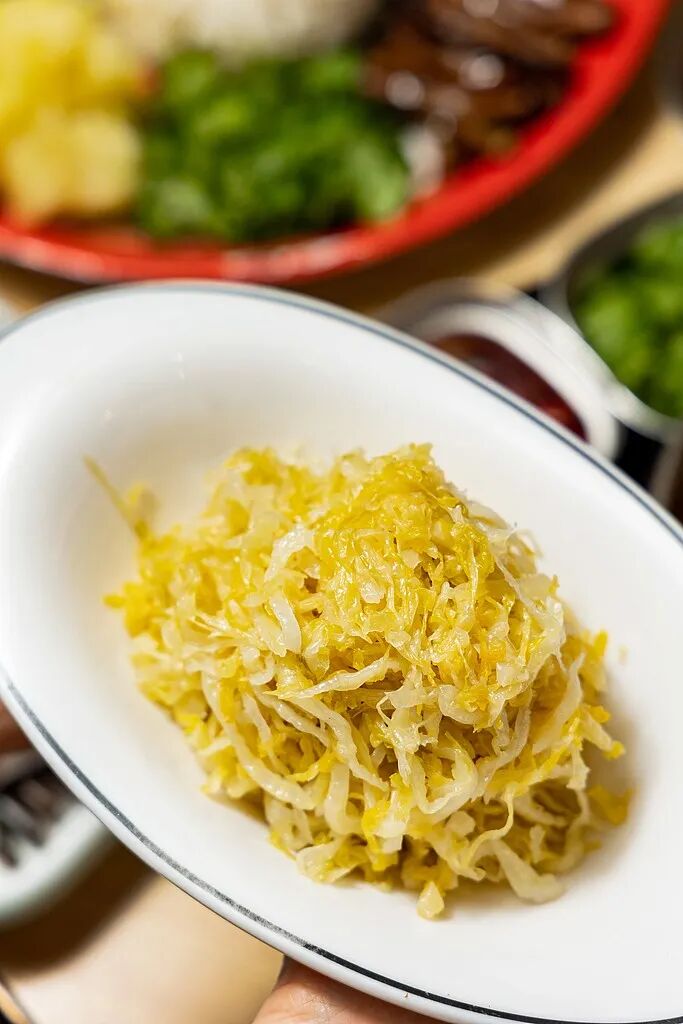大概是怕一整個冬天會吃膩煩,所以關于白菜的烹飪花樣,祖輩們也就總是有花不完的心思。除了日常的醋溜白菜、白菜豆腐湯、白菜豬肉餃子等等,還可壓上石頭放入缸里,做成酸鮮可口的酸菜。繼而發展出更多以酸菜為主要食材的花樣兒:汆白肉、酸菜血腸火鍋、炒酸菜、酸菜餃子……還可以制成爽口鮮辣的辣白菜。