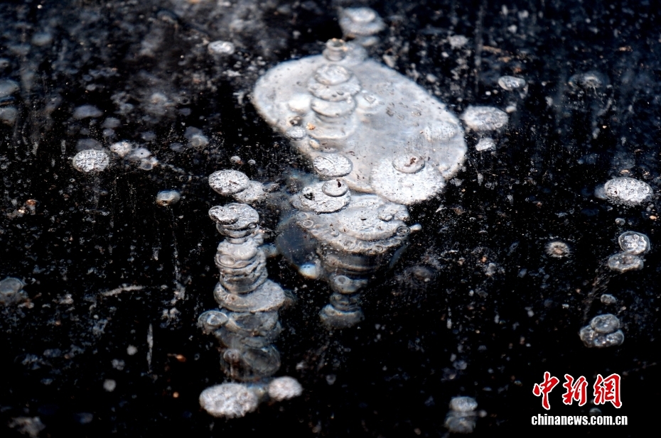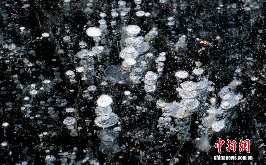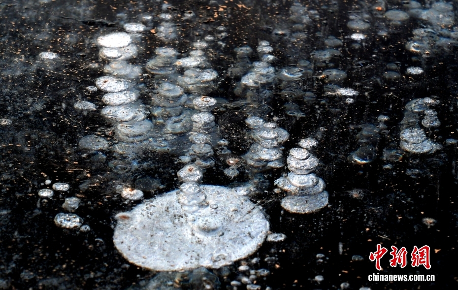 2025年12月20日,遼寧省沈陽市,東陵荷花湖出現“冰泡”奇觀。透過冰面可以看到大小不一造型各異的“冰泡”分布于冰層,十分美麗壯觀。