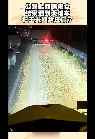 公路上面曬糧食,結(jié)果遇到大堵車(chē),把玉米都給壓扁了!