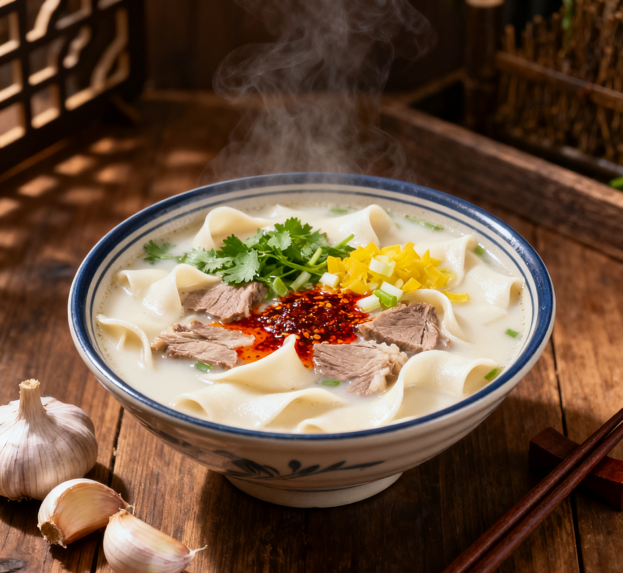 湯是前一晚就熬好的。羊骨在鍋里沉默了一夜,文火未停,熱度未散。等到清晨,再添一把火,湯色便慢慢變得濃白,香味沿著街道擴(kuò)散開(kāi)來(lái)。