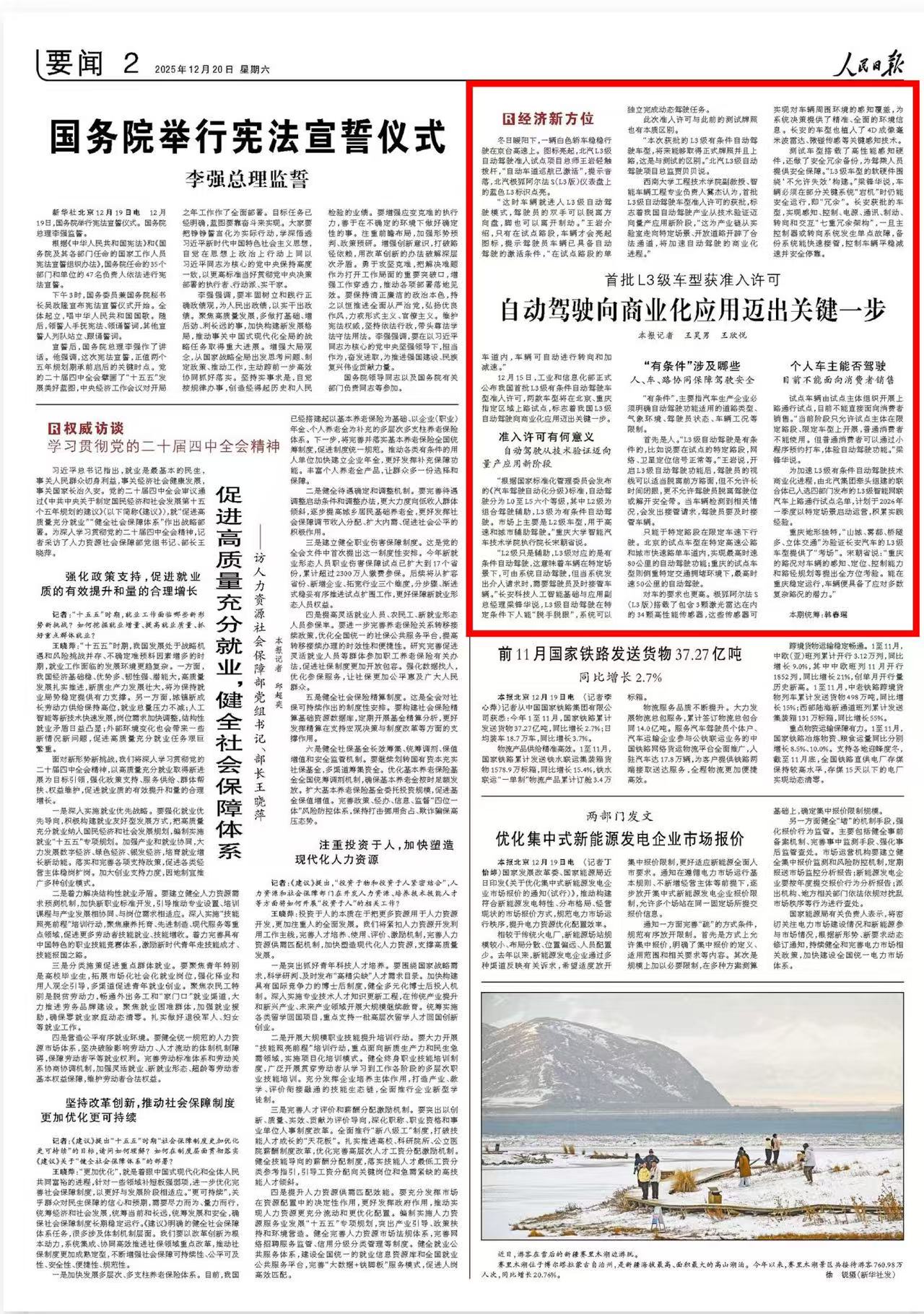 12月15日,工業和信息化部正式公布我國首批L3級有條件自動駕駛車型準入許可,兩款車型將在北京、重慶指定區域上路試點,標志著我國L3級自動駕駛向商業化應用邁出關鍵一步。