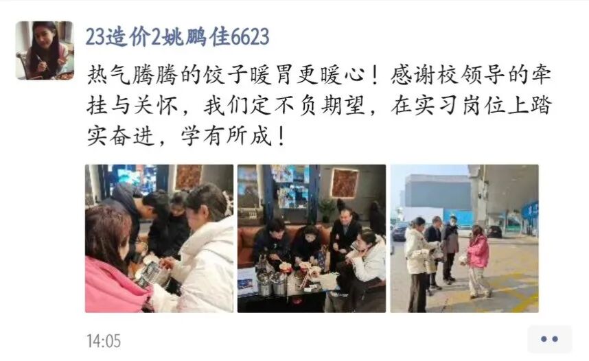 來自重慶的李前坤同學在河南鑫宇光的食堂里,看著老師親手包的餃子感慨:“離家千里,卻在冬至收到了最貼心的關懷,城院就是我的第二個家!”就職于嵐圖的22級畢業生學長與實習學子同坐一桌,更是動情:“沒想到畢業了還能收到學校的溫暖,看來母校一直記著我在這里!”黃河迎賓館的實習學子們組團給老師打來電話說:“我們白經理都夸學校暖心,我們為自己是城院人驕傲!謝謝母校!” 高速鐵路客運服務專業學子不忘臨走時與老師合影,還告訴閨蜜:“寒冬里老師送來了一碗熱餃,這是我奮斗路上最足的底氣!”?