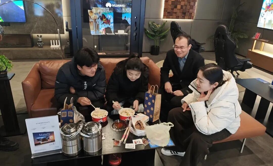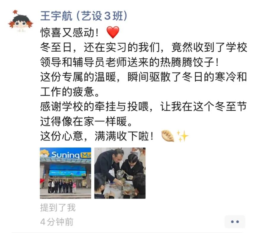 藝術設計、視覺傳達與工程造價等專業的老師們則前往蘇寧易購看望實習學子,將溫暖與熱餃送到身邊;