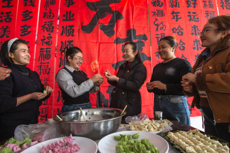 12月18日,庫(kù)車市應(yīng)急管理局駐烏恰鎮(zhèn)甬庫(kù)振興村工作隊(duì)隊(duì)員和村民一起包餃子,迎接冬至的到來(lái)。通訊員 袁歡歡 攝