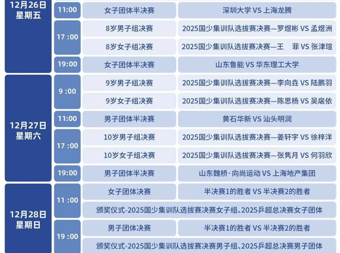屆時(shí),首場(chǎng)比賽將于12月26日上午11點(diǎn)舉行,孫穎莎所在的深圳大學(xué)迎戰(zhàn)上海龍騰。晚上7點(diǎn)時(shí),王曼昱所在的山東魯能將和華東理工大學(xué)展開決戰(zhàn)。在27日,男團(tuán)的兩場(chǎng)半決賽也會(huì)如期上演。根據(jù)央視安排,本次的乒超總決賽,CCTV5以及賽事頻道都會(huì)進(jìn)行直播,這對(duì)于球迷來(lái)說(shuō)是一大利好。