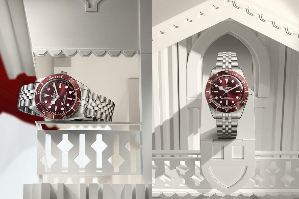 于2025年初全新登場的碧灣1958型酒紅色外圈款,沿襲上世紀50年代風靡的39毫米表殼比例,并融入品牌上世紀九十年代原型腕表的酒紅色表盤美學要素,復古氣質與現代技術并重。腕表搭載帝舵表原廠機芯MT5400-U型,配備硅游絲,具有65小時動力儲備,同時還通過了大師天文臺精密時計認證。腕表提供五鏈節、三鏈節金屬表帶及橡膠表帶三種款式,均配備帝舵表“T-fit”快速調節系統,確保佩戴靈活舒適。