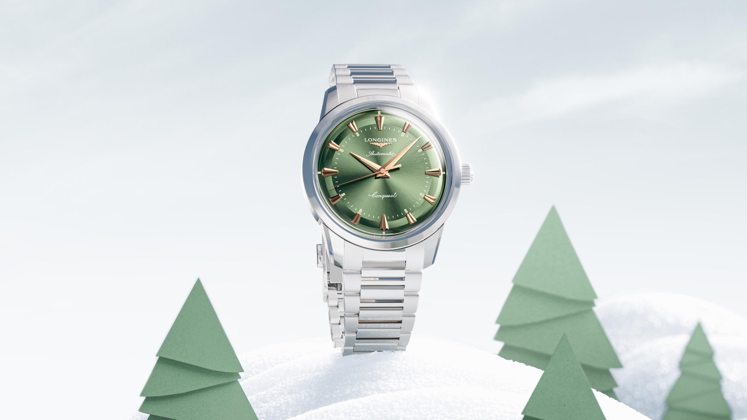 康卡斯復刻系列腕表的綠色拱形太陽紋表盤呼應雪中松影,立體鑲嵌的玫瑰金色時標,搭載浪琴表專屬L888.5自動上鏈機械機芯,動力儲存約72小時,以精準性能,記錄冬日里每個彌足珍貴的瞬間。