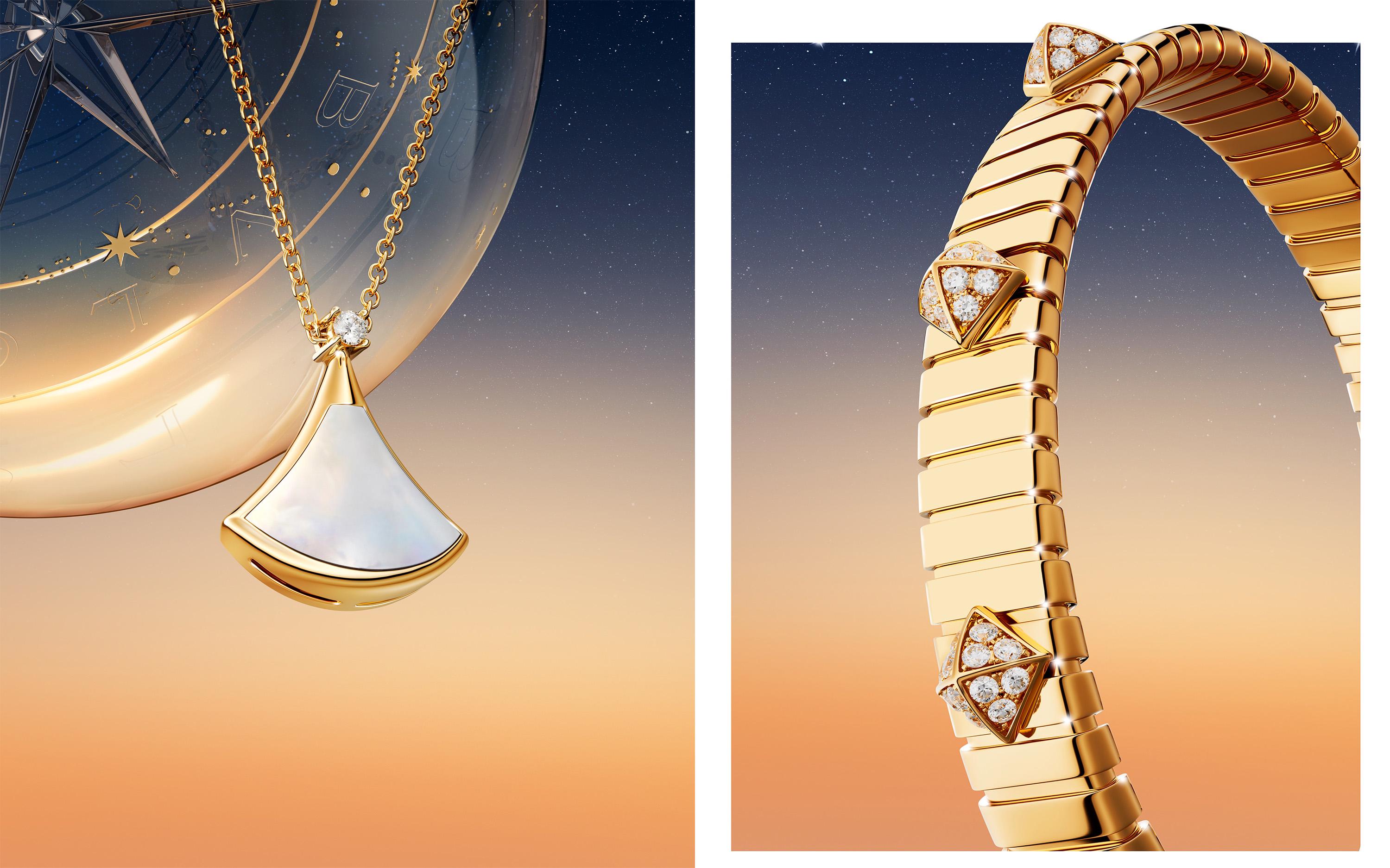 Divas’Dream系列珠寶以經典扇形設計搭配白色貝母,宛如冬日初雪,映照出純凈而歡愉的節日氛圍,熠熠鉆石如天際流星,于頸間閃爍著皎潔光芒。Tubogas系列手鐲采用品牌經典的Tubogas工藝,鑄就光滑而富有韌性的金屬鏈帶,18K黃金材質將羅馬金色暖陽的耀眼光芒匯聚于此,搭配鉆石釘飾,于疊戴中釋放從容風采。