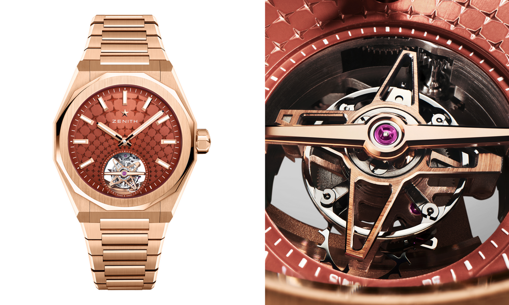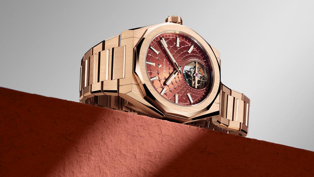 DEFY巔峰系列新作首次通體采用金質材質,搭配同色系金屬表鏈,重釋前衛風格。采用玫瑰金材質打造的陀飛輪腕表以6時位置的陀飛輪視窗為中心向外放射,致敬真力時位于力洛克的歷史制表廠。41毫米玫瑰金表殼經緞面與拋光交替潤飾,磚紅色太陽紋表盤鐫刻四芒星圖案。腕表搭載El Primero 3630型高振頻自動上鏈機芯,陀飛輪框架呈品牌“雙Z”四芒星造型,每60秒旋轉一圈。腕表配備玫瑰金H形鏈節表鏈,并附贈同色系磚紅色橡膠表帶及玫瑰金折疊表扣。