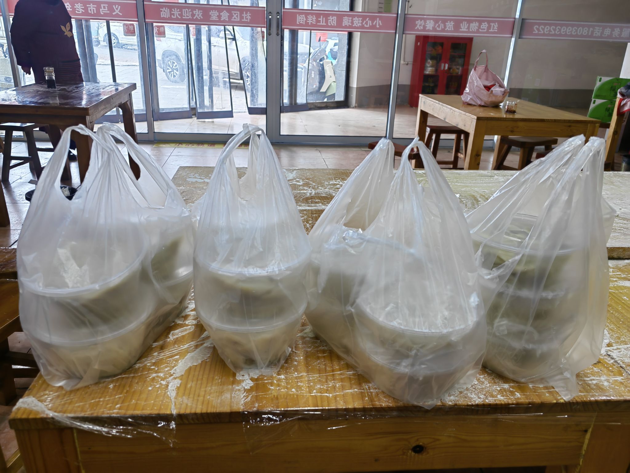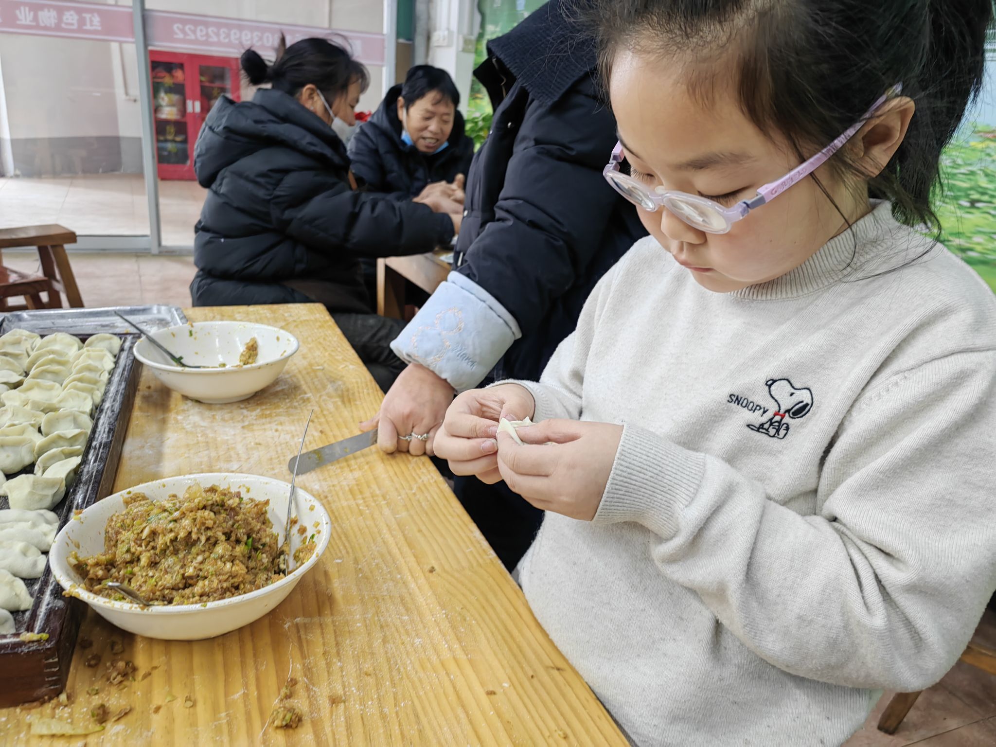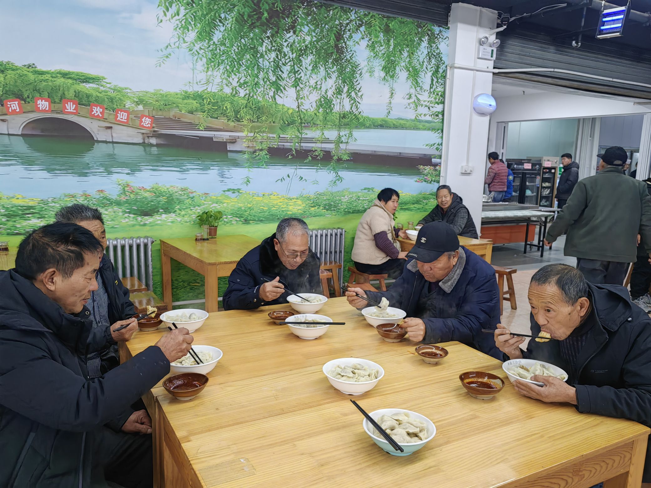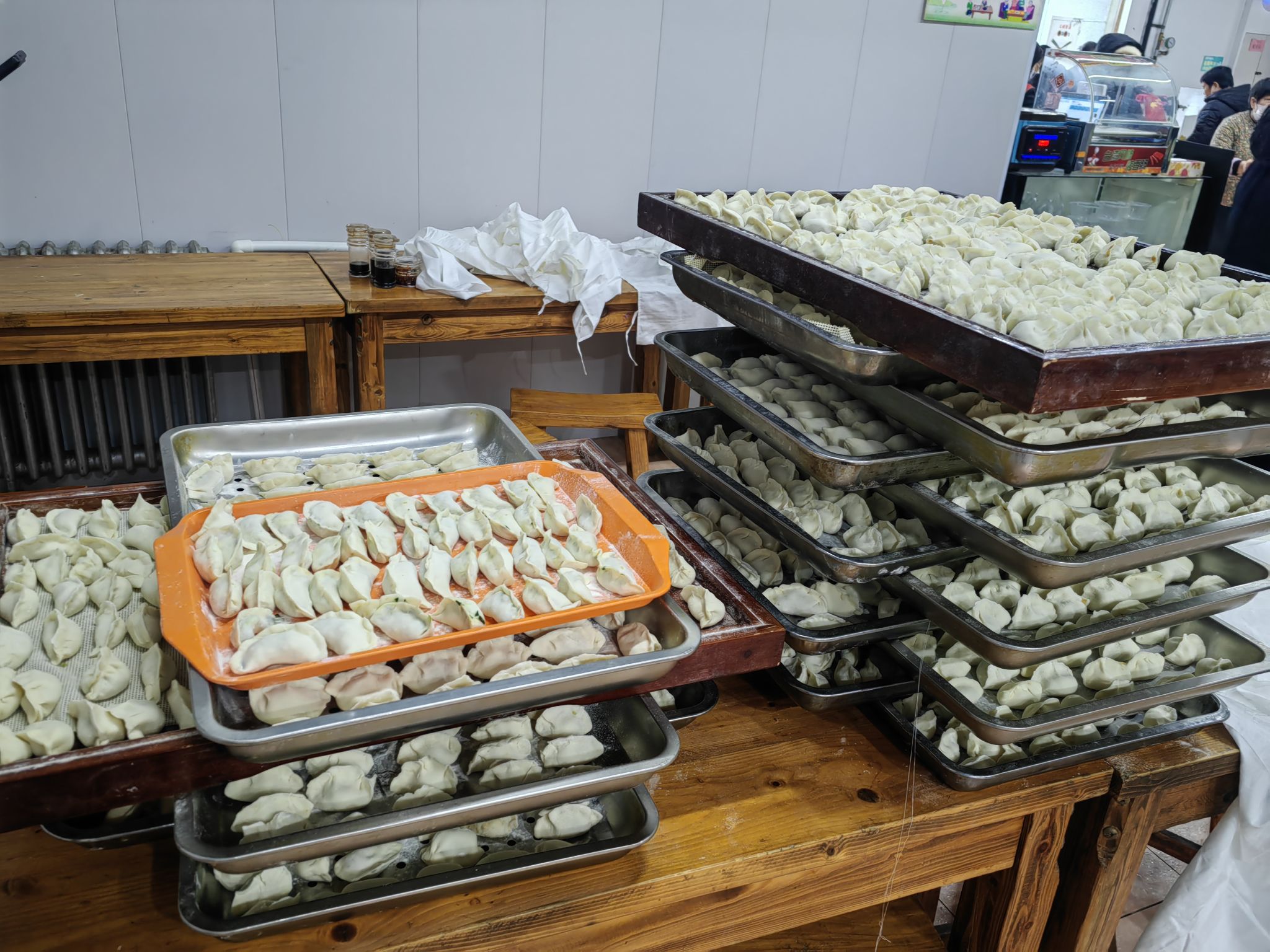 木桌擺開,蒸汽裹著餃子的白