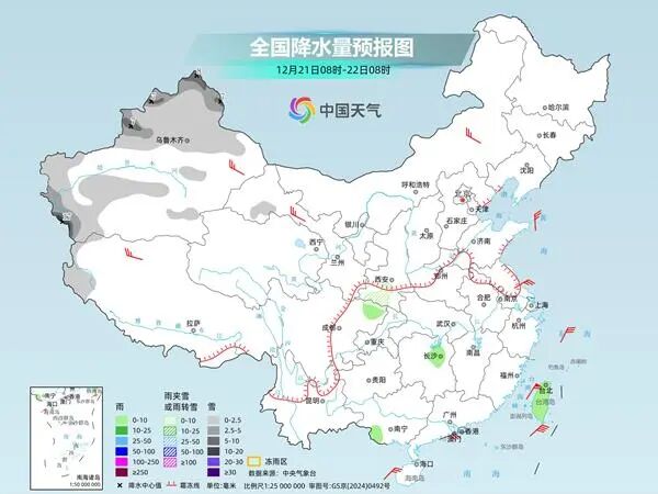 22日,新疆南疆西部山區、甘肅河西、陜西北部、內蒙古中東部、東北地區西部、華北北部等地部分地區有小雪或雨夾雪,其中,新疆南疆西部山區部分地區有中到大雪,局地暴雪。黃淮大部、安徽中北部、江蘇北部、江漢大部、湖南北部和西部、四川盆地中東部、重慶、貴州大部、廣東東南部、海南島東北部、臺灣島大部等地部分地區有小雨。