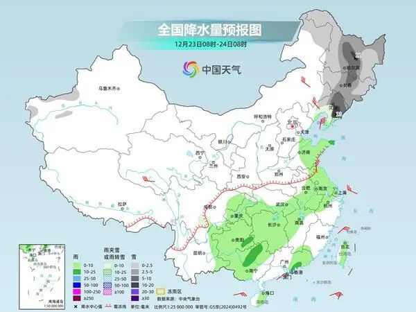 23日,內蒙古東北部、東北地區等地部分地區有小到中雪或雨夾雪,其中,黑龍江中部、吉林東部、遼寧中東部等地部分地區有大雪,局地暴雪。黃淮東部、江淮大部、江漢東部、江南北部和西部、西南地區東部、華南大部、臺灣島大部等地部分地區有小雨,其中,山東半島、貴州東南部、廣西西南部和東北部、廣東東南部等地部分地區有中雨。