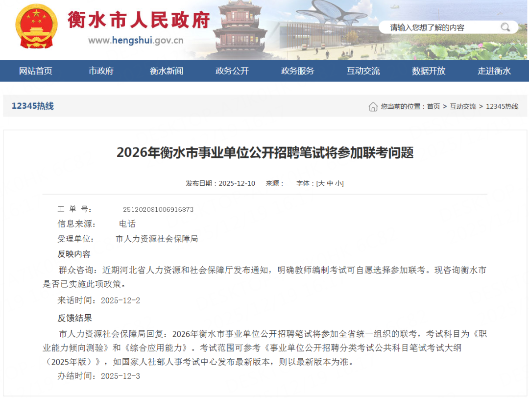 市人力資源社會(huì)保障局回復(fù):2026年衡水市事業(yè)單位公開招聘筆試將參加全省統(tǒng)一組織的聯(lián)考,考試科目為《職業(yè)能力傾向測(cè)驗(yàn)》和《綜合應(yīng)用能力》。考試范圍可參考《事業(yè)單位公開招聘分類考試公共科目筆試考試大綱(2025年版)》,如國家人社部人事考試中心發(fā)布最新版本,則以最新版本為準(zhǔn)。