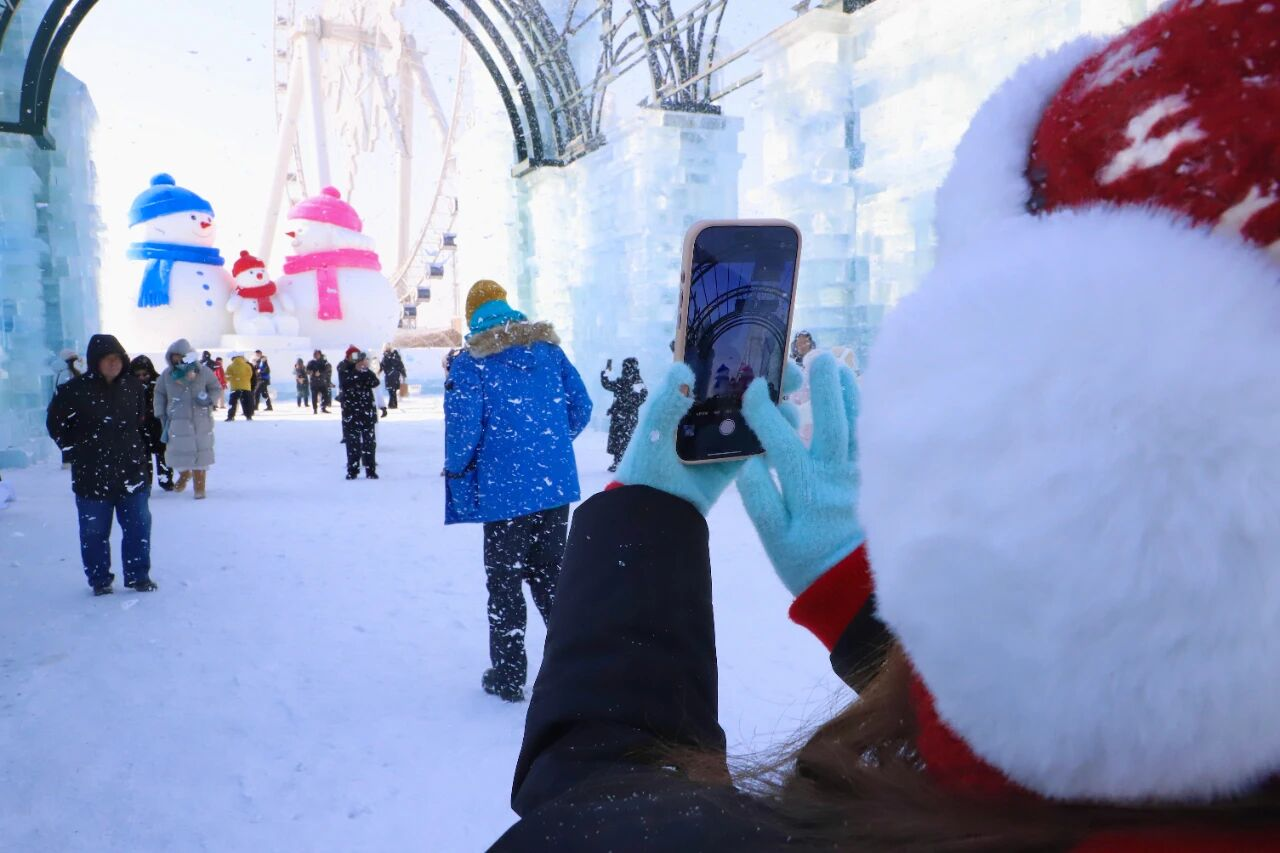 12月17日,游客在哈爾濱冰雪大世界游玩拍攝。新華社記者 徐凱鑫 攝