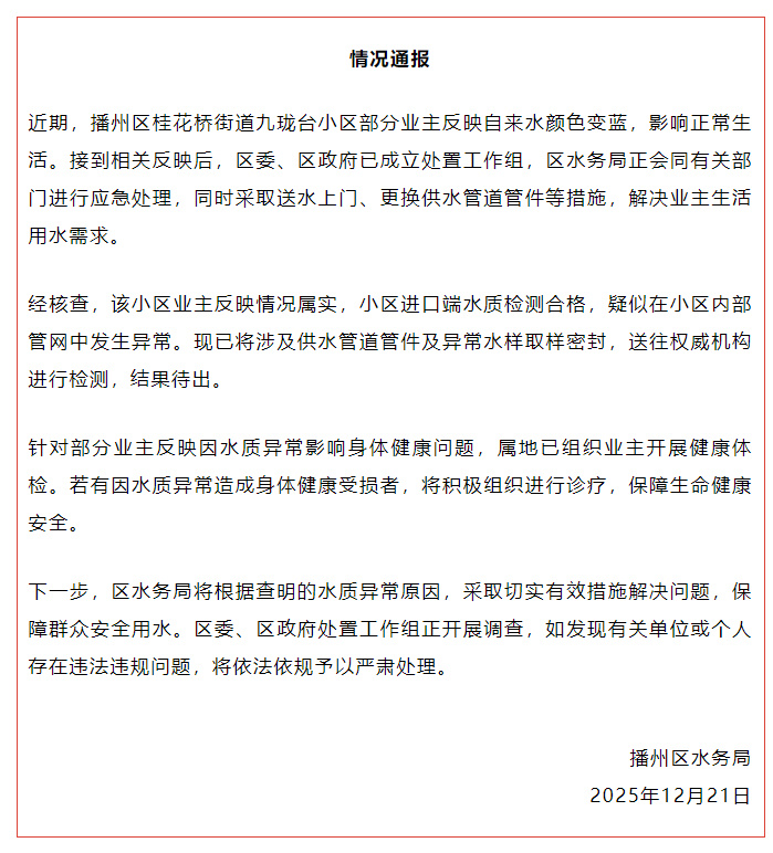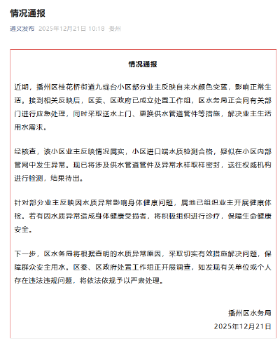 近期,播州區桂花橋街道九瓏臺小區部分業主反映自來水顏色變藍,影響正常生活。接到相關反映后,區委、區政府已成立處置工作組,區水務局正會同有關部門進行應急處理,同時采取送水上門、更換供水管道管件等措施,解決業主生活用水需求。