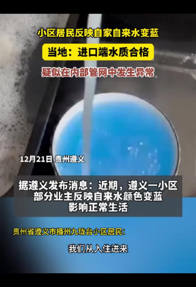 據此前報道,有居民反映貴州省遵義市播州區九瓏臺小區自來水“藍得看不到底”,更換管道后發現大量固體藍色堆積。
