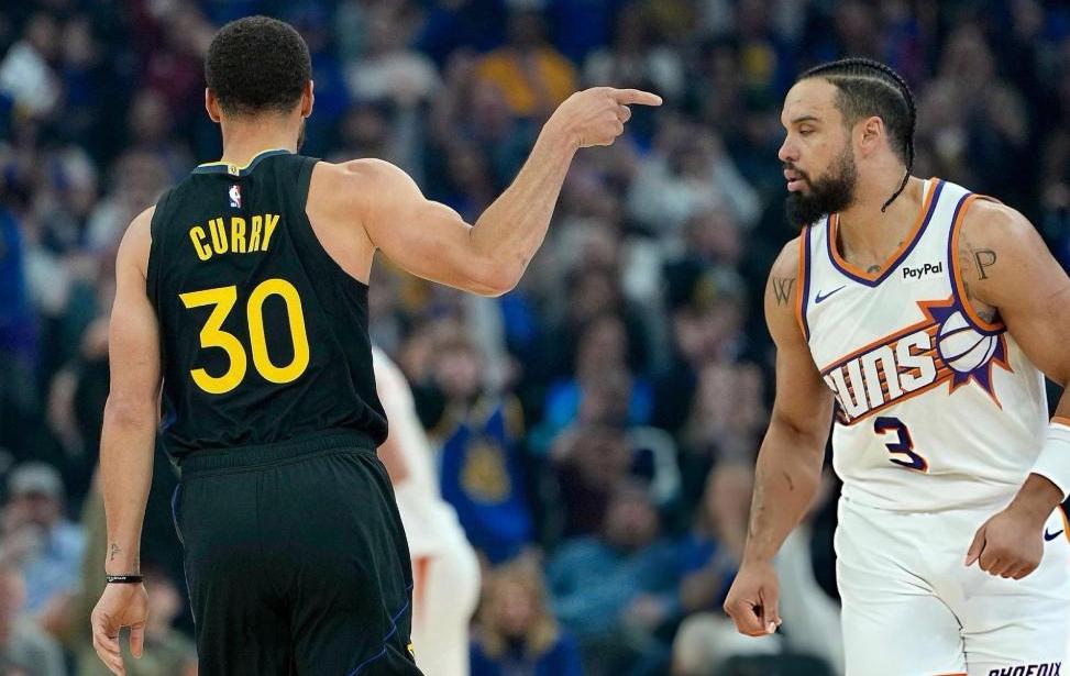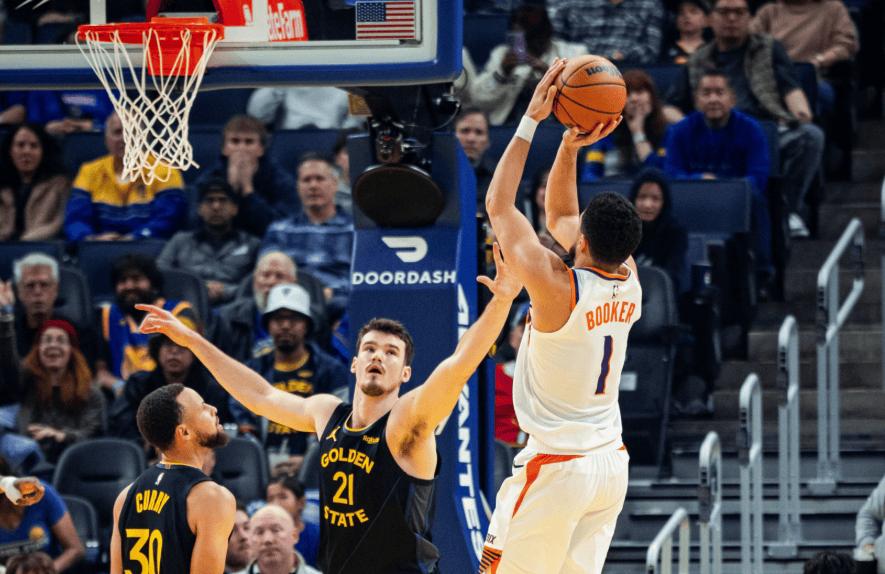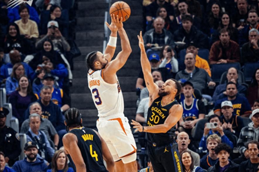 首節比賽,太陽進攻火力拉滿,單節轟出44分并占據主動權,第一節比賽結束,太陽44-32領先勇士12分。次節比賽開始,庫里面向突破如狼似虎,飛身上籃幫助勇士先下一城,吉萊斯皮眼疾手快,搶斷快攻一條龍上籃得手,波斯特定點三分跳投一擊命中,庫里的高難度三分球打進還有加罰,布克的橫移跳投中距離兩分落袋,理查德義無反顧強起補籃得手,布克手感火熱,同樣的位置中距離再進一球,理查德不甘示弱,連續飆射兩個三分球都有,勇士在進攻端漸入佳境,逐漸縮小比分差距到5分以內。半場比賽戰罷,太陽67-64領先勇士3分。