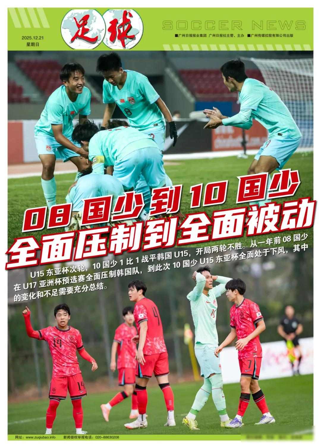 昨天那場球,中國U15國少隊和韓國隊踢成1比1,潘朝偉點球打進一個,韓國隊靠角球頭球追平比分,下半場差點再進一球,替補門將陳城云把球撲出,整場比賽數據被壓制,控球只有42%,射門次數也少,角球是1比6,完全沒有占到優勢。