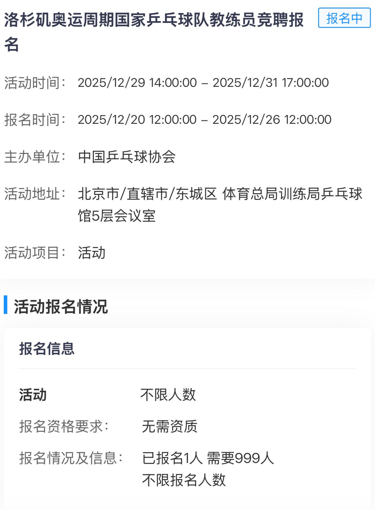北京時間12月20日,中國乒協正式啟動洛杉磯奧運周期國家隊教練員競聘工作。這是一次面向2028年的系統性重組,而不是簡單的人員輪換。
