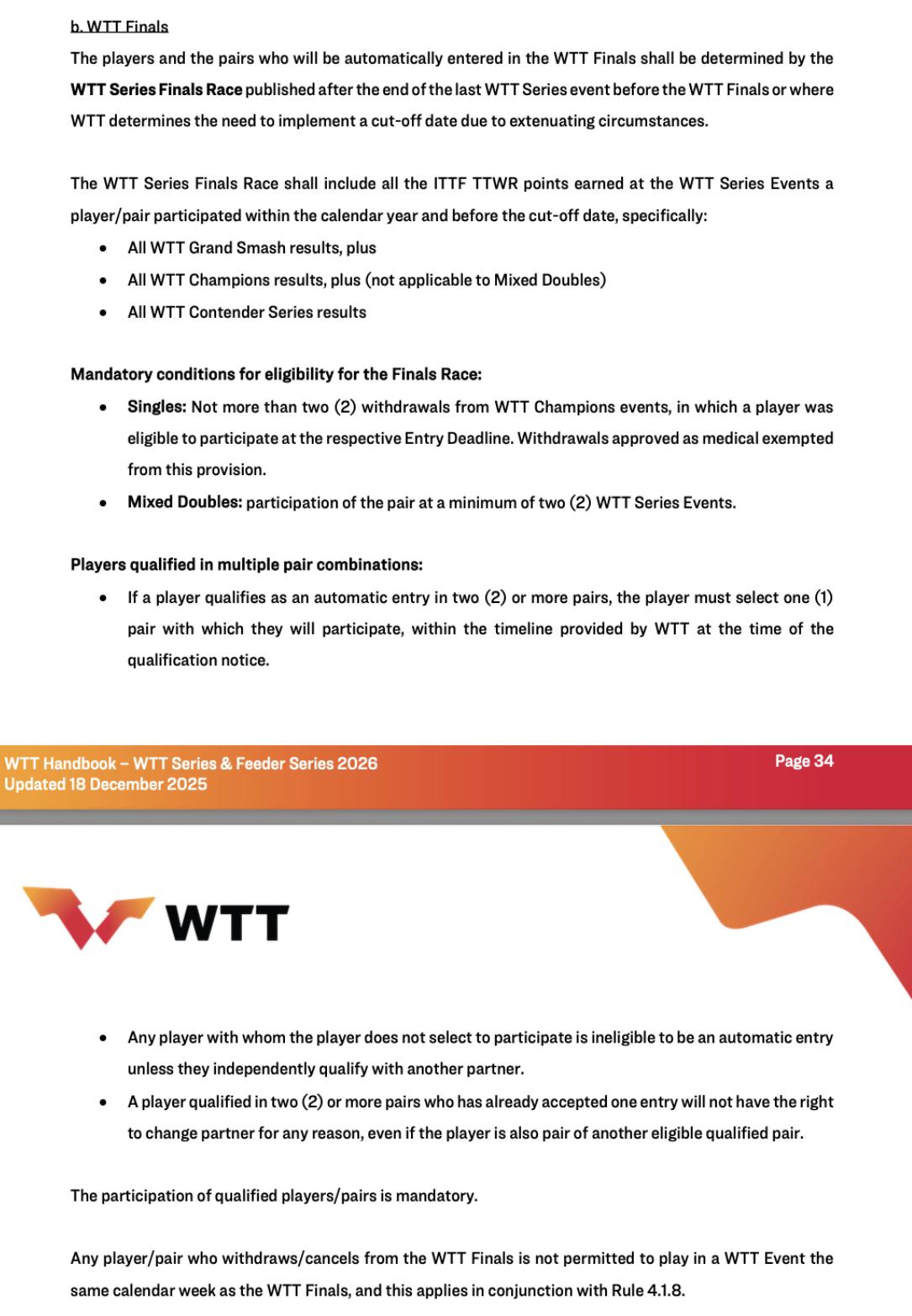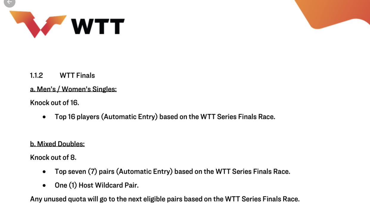 與此同時,混雙新增了參賽門檻,混雙組合需至少參加兩站WTT系列賽,才能獲得總決賽資格。這條規則就是要避免臨時拼搭占用名額,也在一定程度上維護了項目的連續性。對長期搭檔來說,是保護;對偶發組合,則是約束。