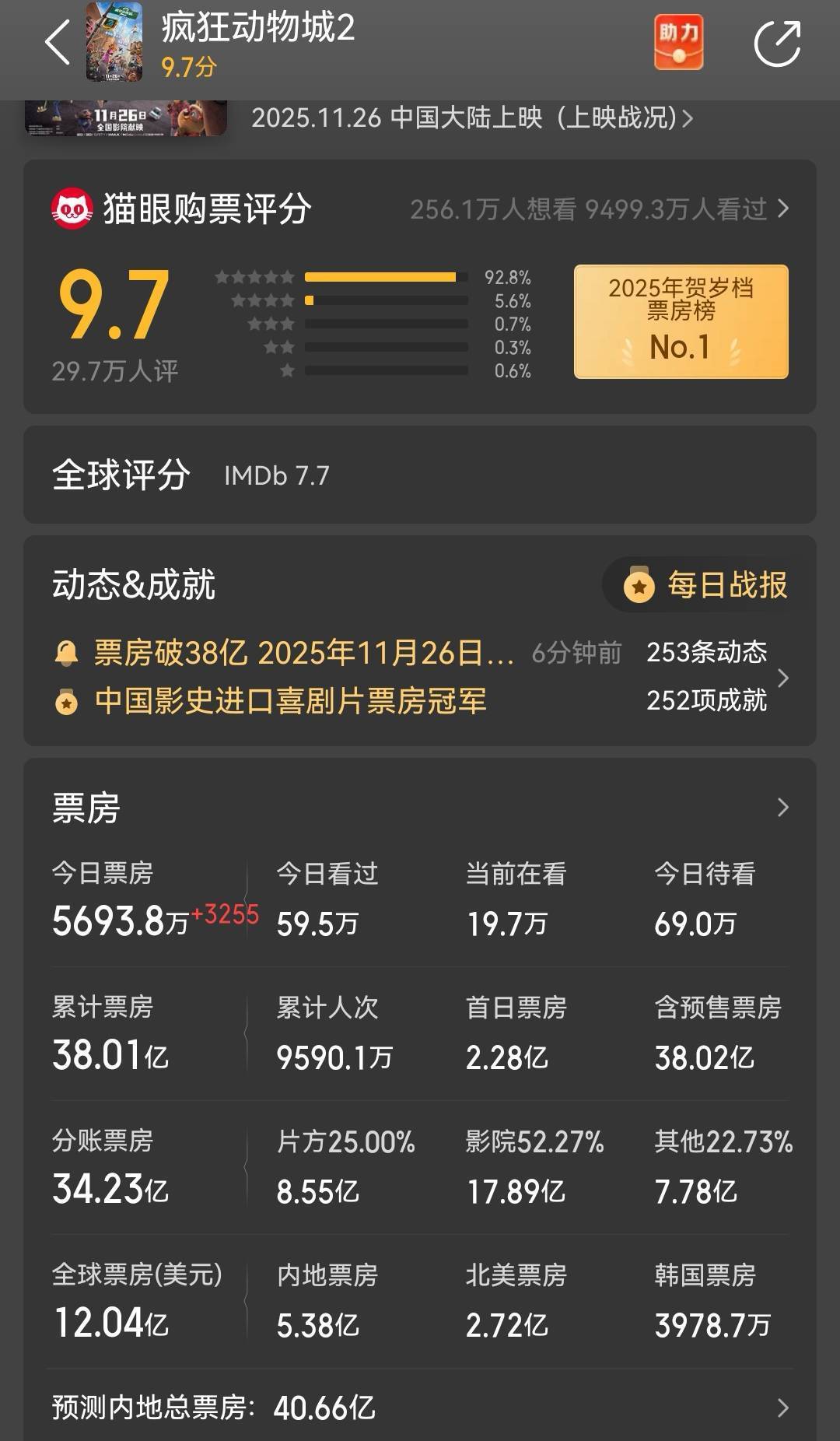 《瘋狂動物城2》周末單日仍有七千萬到近億元的收入,貓眼專業版預測其最終總票房可能達到40.66億元,燈塔專業版的預測是40.81億元。