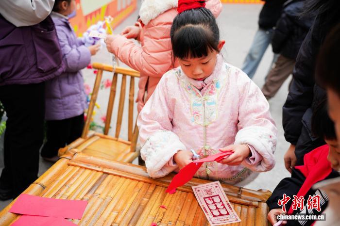 圖為小朋友參與冬至活動中的剪紙游戲。金鴻宇 攝