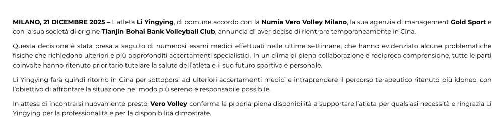 聲明感謝米蘭排球俱樂部嚴謹細致的職業態度和在此過程中給予的理解和配合,并表示李盈瑩回國后,將為她安排最好的醫療和康復條件,確保她盡快恢復,早日重返賽場。