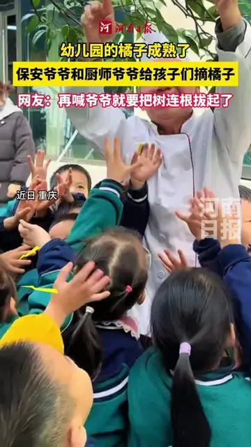 #再喊爺爺就要把樹連根拔起了 幼兒園的橘子成熟了,保安爺爺和廚師爺爺給孩子們摘橘子,在一聲聲爺爺中迷失自我。 #葫蘆娃爺爺 #萌娃